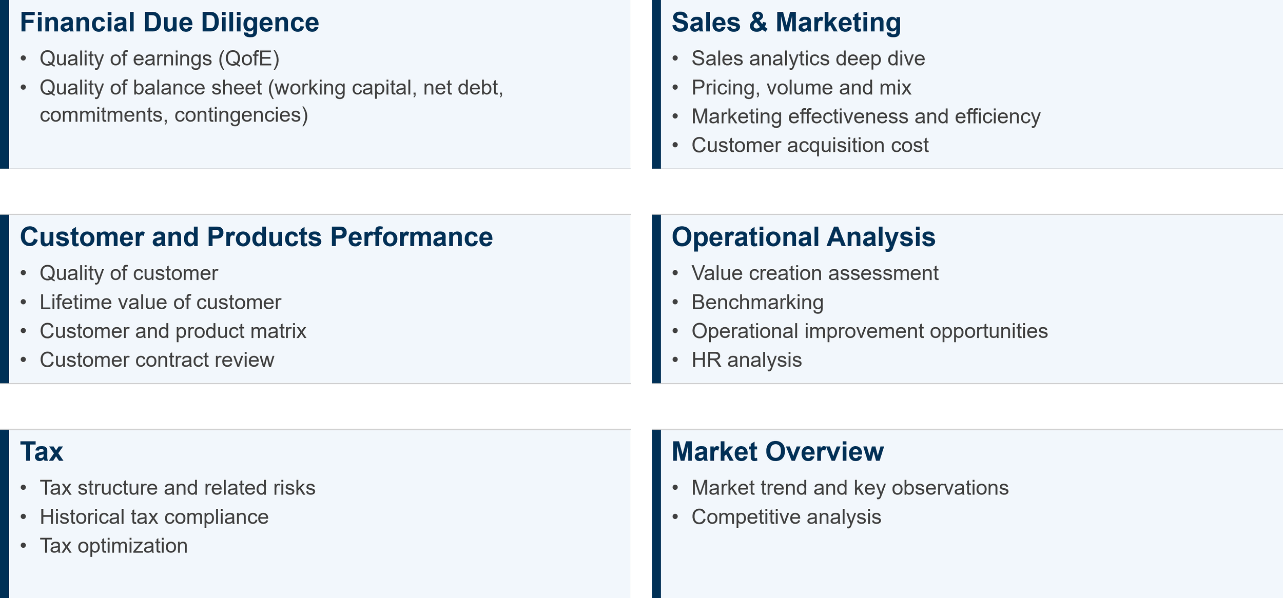 Our due diligence goes beyond traditional quality of earnings, we analyze all internal aspects of a firm, ranging from customers data to general ledger